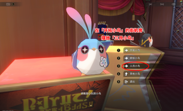 3、然后在三台街机上摆放「开拓小鸟」,然后在「开拓小鸟」旁摆放「三月小鸟」即可完成该成就。