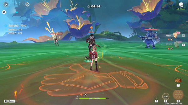 站在中间打遗迹机器人和镀金旅团,班尼特放Q技,绫人放Q技,坎蒂丝放QE技,绫人放EAAA技。