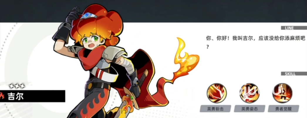 一技能名为英勇斩击,有60%的概率提升自己的攻击力,二技能叫英勇姿态,能够进入勇者状态,进入勇者状态后,吉尔的大招威力提升到200,打出伤害之后解除勇者形态,如果放大招的时候吉尔不是勇者状态,那么对手还会受到吉尔生命值上限的固定伤害。